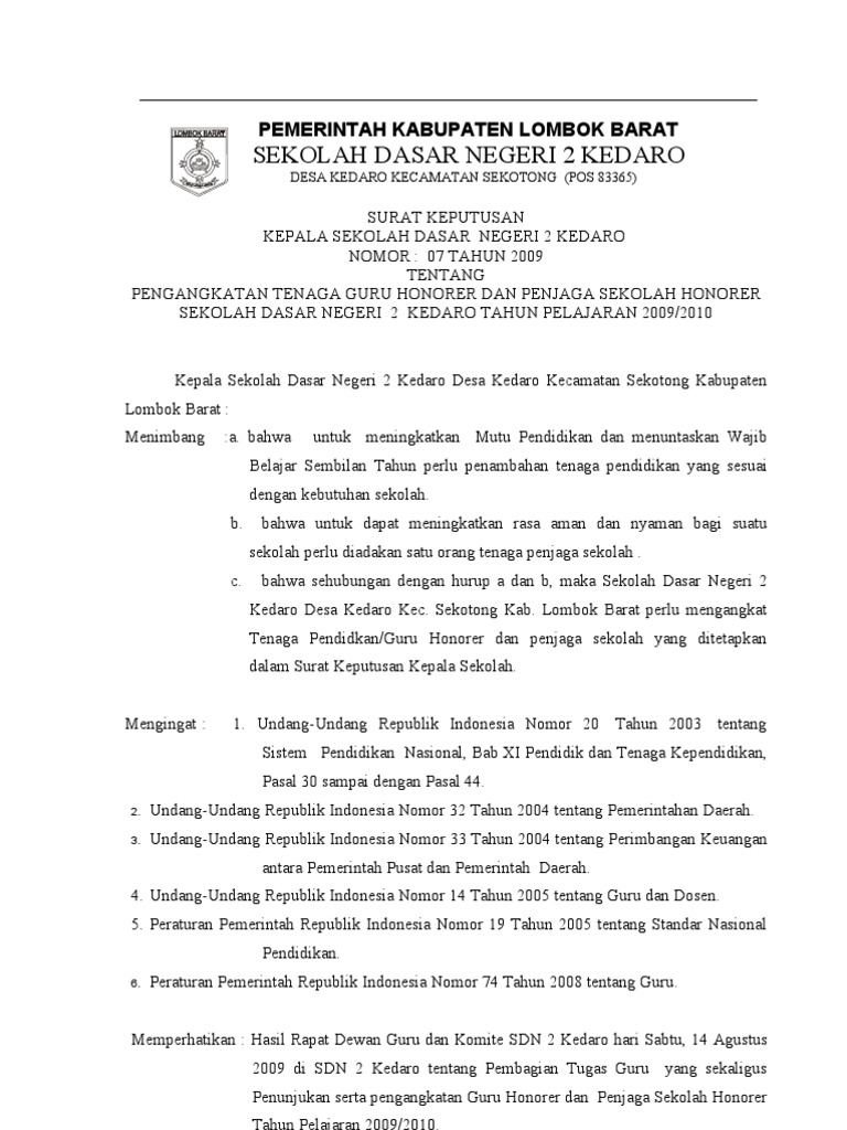 Contoh sk guru honor. Kumpulan contoh surat keputusan sk kepala sekolah lengkap administrasi sekolah sk kepala sekolah surat keputusan atau yang biasa lebih dikenal dengan sk merupakan sebuah surat pernyataan yang dikeluarkan oleh lembaga tertentu formal maupun non formal yang berisi suatu kebijakan atau keputusan tertentu yang berhubungan dengan lembaga tersebut. File contoh sk pengangkatan guru honor format microsoft word pada link di atas yang bisa anda download ini disimpan di cloud storage google drive untuk menjamin keamanan file dari virus atau malware file otomastis melewati proses scan anti virus oleh sistem google drive. Contoh sk guru honorer terbaru sd smp smasmk tahun 20192020 merupakan sebuah surat keputusan yang diberikan oleh kepala sekolah untuk memenuhi arsip administrasi atau sebagai bukti bagi gtt honor yang akan mengabdi di sekolah tersebutnah bagi anda yang ingin membuat sk namun tidak tahu caranya disini admin kan membagikan conoh sk honorergtt yang dapat anda unduh diakhir postingan ini. Anda bisa mendownloadnya secara gratis. Kumpulan dokumen file guru modul guru pembelajar slbtksdsmpsmasmk lengkap 2016. Jenis filenya adalah word sehingga anda bisa langsung mengeditnya dan menyesuaikan dengan sekolah anda.