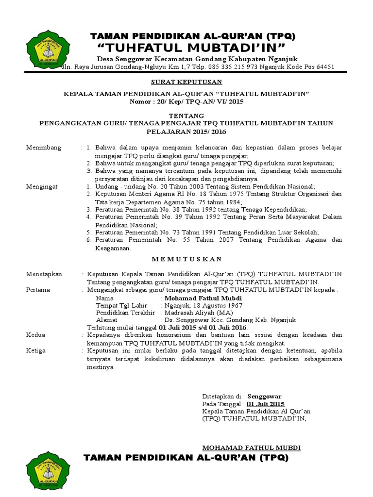 Download contoh sk guru ngaji dari desa. Kumpulan dokumen file guru modul guru pembelajar slbtksdsmpsmasmk lengkap 2016. Contoh sk tukang mandi jenazah demi efektifitas kegiatan pembinaan kemasyarakatan dan pemberdayaan masyarakat khususnya menyangkut pendidikan agama islam di desa kepala desa dapat mengangkat guru ngaji taman pengajian al quran tpqtpa ustadzustadzah desapengurus balai pengajian melalui keputusan kepala desa kades atau surat keputusan kepala desa sk. Oleh admin diposting pada 17 juli 2017 10 september 2017.