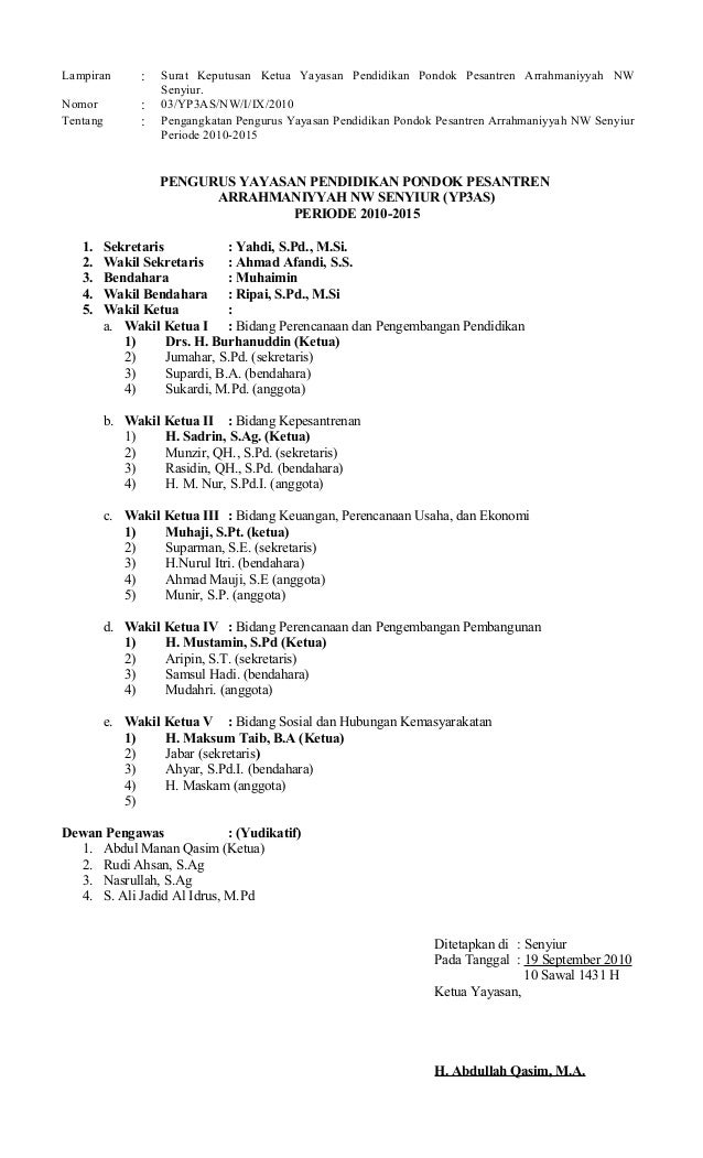 Pengurus yayasan fathul hidayah periode 2015 2020 1. 15 contoh surat keputusan yang baik dan paling lengkap dalam suatu instansi perusahaan lembaga organisasi maupun beberapa kelompok lainnya tentu akan pernah menggunakan salah satu contoh surat yang satu ini yakni surat keputusan. Download rpp silabus prota prosem kkm skkd ktsp 2006 sd kelas 5. Surat keputusan dewan pembinayayasan fathul hidayah sodonghilir. Surat keputusan ketua yayasan miftahul huda. Pengangkatan kepala madrasah diniyah miftahul huda 520 ciporos.