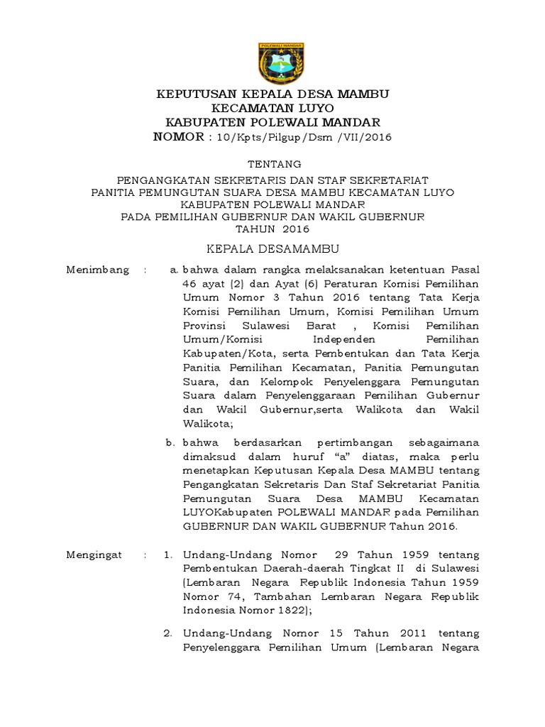 Contoh sk pengangkatan anggota sekretariat panitia pemungutan suara pemerintah kabupaten trenggalek. Sk sekretariat ppk tatono admin kpu kk 2 july 2015 berita informasi publik pilgub sulut 2015 leave a comment 1106 views kotamobagu mungkin karena kesibukan walikota kotamobagu sehingga sk sekretariat ppk dalam rangka pilgub sulut tahun 2015 hingga kini belum juga ditandatangani. Contoh sk sekretariat pps pilgub jatim 2013. Kpu kabupaten trenggalek nomor 15kptskpu kab 0143296872013 tanggal 22 maret 2013 tentang pengangkatan anggota pps dalam pemilihan umum kepala daerah dan wakil kepala daerah provinsi jawa. Surat camat manguharjo nomor. Staf sekretariat urusan tata usaha keuangan dan logistik pemilihan.