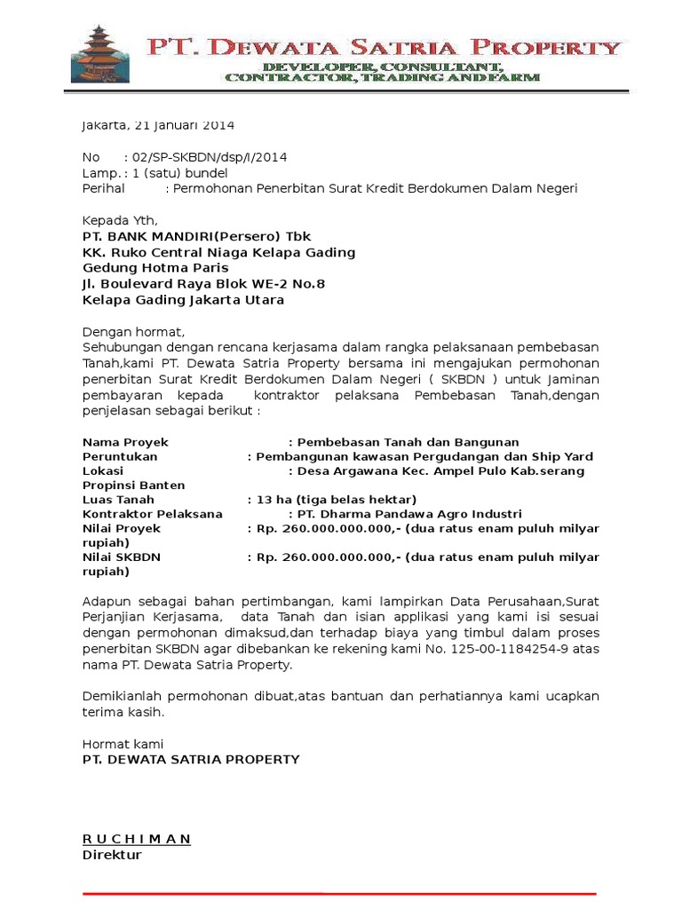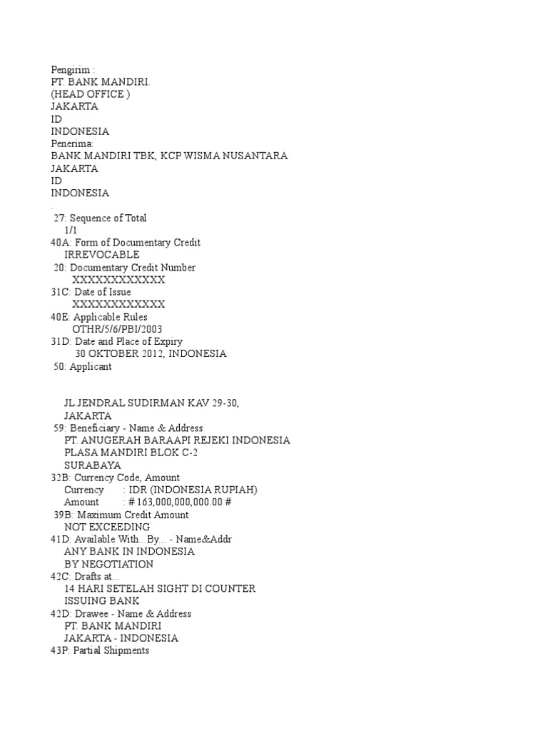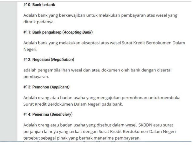 Contoh skbdn bank mandiri. Membebaskan bank dari dan terhadap setiap dan semua pembayaran kerugian biaya biaya yang mungkin dideritaditanggung oleh atau diwajibkan kepada bank yang berhubungan dengan atau karena penerbitan lc atau skbdn pada setiap waktu termasuk tetapi tidak terbatas pada biaya yang timbul dari pembayaran bank atas lc atau skbdn. Skbdn yang dikeluarkan oleh bank seperti bank mandiri dapat dilakukan dengan menggunakan berbagai fasilitas yang disediakan. Pembayaran terhadap surat kredit berdokumen dalam negeri skbdn tersebut baru akan dilakukan oleh pihak pertama. Surat kredit berdokumen dalam negeri skbdn atau yang sering disebut dengan lc lokal adalah janji tertulis dan tidak dapat dibatalkan irrevocable yang diterbitkan oleh bank pembuka issuing bank atas instruksi dari pemohon applicant untuk membayar sejumlah uang kepada penerima beneficiary sepanjang syarat dan kondisi yang tercantum di dalam skbdn terpenuhi. Bank pengkonfirmasi confirming bank adalah bank yang mengkonfirmasi skbdn dengan mengikatkan diri untuk membayar mengaksepmengambil alih wesel yang ditarik atas skbdn tersebut. Bab 17 surat kredit berdokumen dalam negeri skbdn amanitanovi at unyacid 166 4.