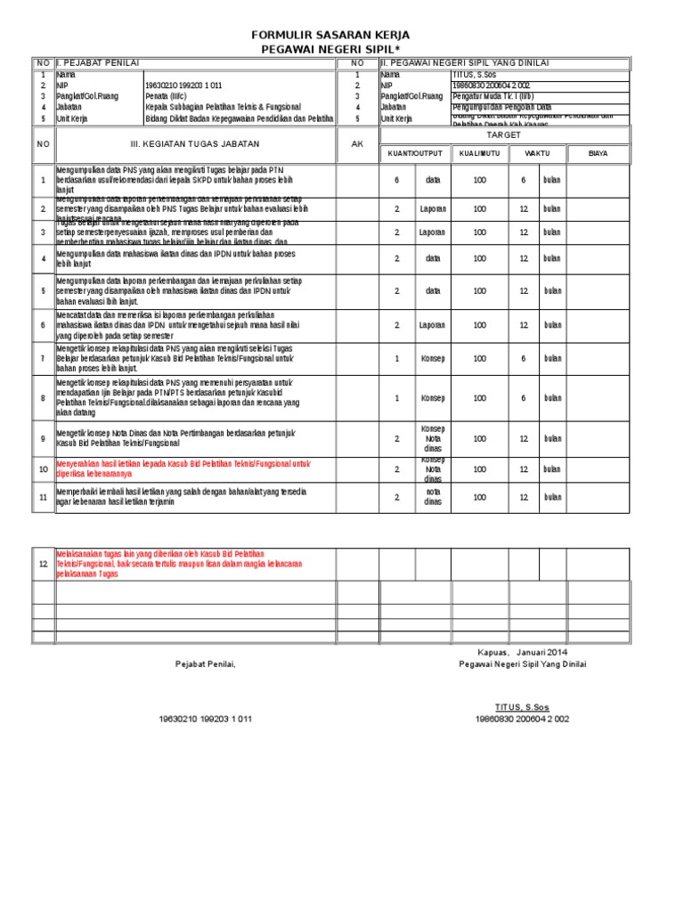 Contoh skp pns struktural. Cara penyusunan skp pejabat struktural 2 gustpriyono 2013 11 28t1136000700 50 stars based on 35 reviews ulasan mengenai judul di atas sudah pernah ditulis pada blog saya. Download aplikasi skp pns struktural. Skp pns sasaran kinerja formulir skp cara isi skp aplikasi skp skp format excel download skp download aplikasi skp skp lengkap aplikasi microsoft office aplikasi microsoft word microsoft office aplikasi word excel software aplikasi power point aplikasi microsoft excel membuat aplikasi dengan excel software akuntansi learn excel microsoft excel 2013 microsoft excel 2016 excel program. Pada dasarnya skp cpns sama dengan skp pns yang membedakan cuma jangka waktu penilaiannya misalnya skp cpns dengan tmt 01 april 2015 maka skpnya dibuat tanggal 01 april 2015 dan pengukurannya tanggal 31 desember 2015 jadi jumlah bulannya sebanyak 9 bulan sedangkan kuantitas kegiatan disesuaikan untuk penghitungan tmt ada juga instansi yang mengacu pada spmt ini dapat dikonsultasikan. Download aplikasi skp pns struktural. Berikut tata cara lengkap beserta contoh dalam penyusunan skp tahun 2018 bagi pns di lingkungan pemerintah pusat dan pemerintah daerah.