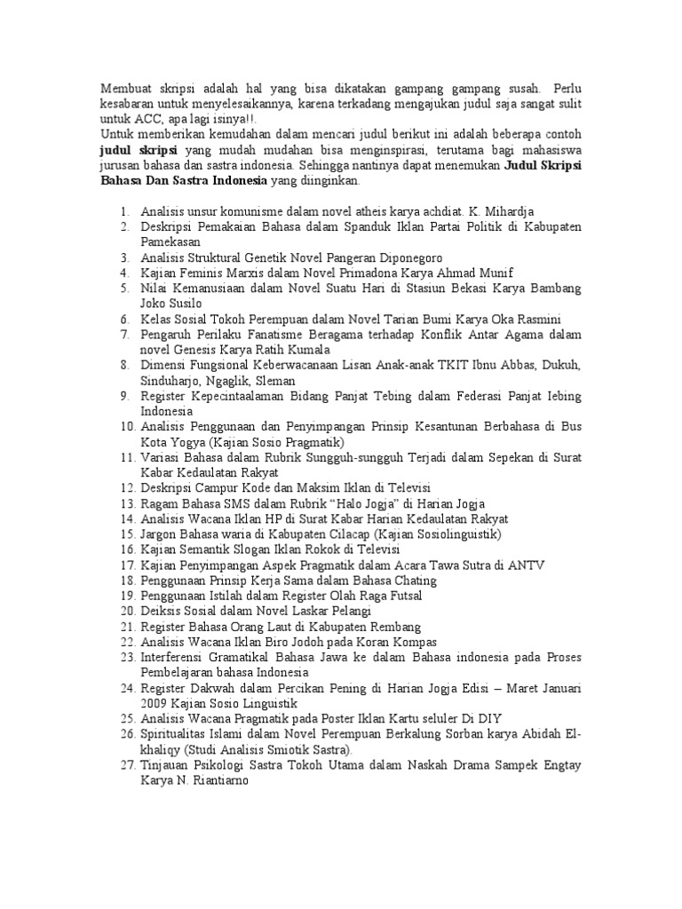 Contoh skripsi bahasa indonesia ini dengan judul. Contoh abstrak bahasa indonesia suatu abstrak yaitu penyediaan potret informasi bagi pembaca mengenai isi karya ilmiah yang telah dilakukan. Contoh judul skripsi bahasa indonesia terbaik mudah dikerjakan keefektifan teknik think pair share berpikir berpasangan berbagi dalam pembelajaran menulis eksposisi siswa kelas x sma negeri 1 piyungan bantul. Contoh proposal skripsi pendidikan bahasa indonesia bisa anda dapatkan melalui situs kami. Academiaedu is a platform for academics to share research papers. Jasa skripsi malang juga melayani beragam jurusan yang tersedia di berbagai kampus di indonesia.