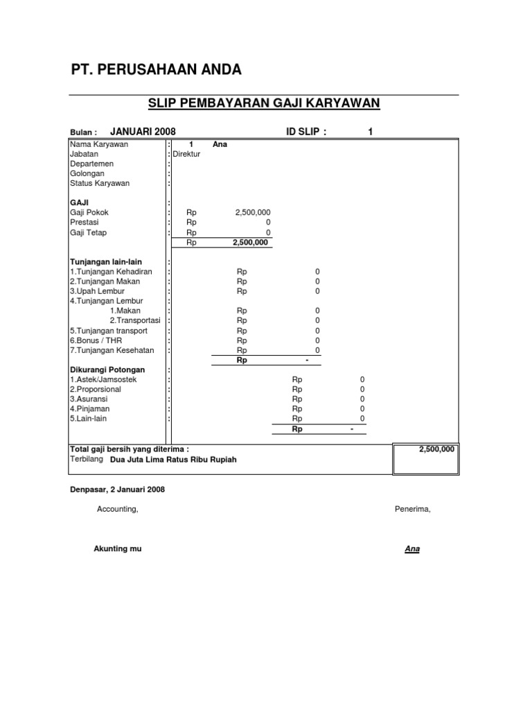Namun slip gaji setidaknya memuat komponen nama perusahaan pernyataan kerahasiaan dokumen tanggal pembayaran data karyawan besarnya gaji dan potongan serta keterangan lengkap mengenai pembayaran gaji seperti keterangan pajak total uang yang diperoleh dan nama bank pembayar. Amalila undip karyawan students no invoice langsung upload slip slip. Biasanya mereka karyawanpekerja mendapatkan gaji beserta slip gajinya sebulan sekali. Contoh surat ini merupakan salah satu syarat yang harus dilengkapi oleh karyawan tersebut dalam mengajukan permohonan pinjaman atau kredit. Contoh slip gaji swasta bulan contoh slip gaji bulanan yang. Download contoh slip gaji excel document slip gaji adalah sebuah surat yang berisikan perincian pembayaran gaji yang diterima oleh seseorang.