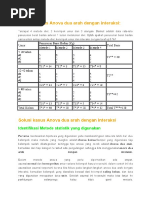 Contoh soal anova satu arah dan dua arah. Contoh soal tentang anava satu arah one way anava tiga kelompok subyek penelitian untuk menguji metode pengajaran mana yang paling baik. Anova dua arah lebih efisien daripada anova satu arah karena. Kali ini kita akan membahas anova satu arah. Dalam anova dua arah kita ingin mengetahui ada atau tidaknya perbedaan beberapa variabel bebas dengan sebuah variabel terikatnya dan masing masing variabel mempunyai dua jenjang atau lebih. Anova dua arah merupakan penyempurnaan anova satu arah. Anova dua arah digunakan peneliti untuk mengatasi perbedaan nilai variabel terikat yang dikategorikan berdasarkan variasi bebas yang banyak dan masing masing variabel terdiri dari beberapa kelompok.
