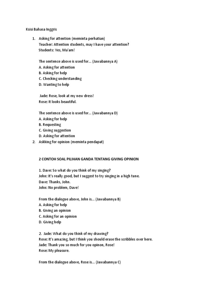Contoh soal asking for attention. Banyak dialog asking for attention pendek diawali dengan contoh dialog checking understanding. Dalam bahasa inggris kita mengenal istilah yang diharapkan untuk meminta perhatian saat kita berbincang bincang atau dalam sebuah kondisi tertentu. Asking attentionmeminta perhatian adalah ungkapan yang digunakan untuk meminta perhatian dari seseorang. Mungkin kalian pernah mendengar tentang contoh kalimat giving opinion tetapi kali ini kita akan memperlajari suatu kalimat yang biasa disebut dengan kalimat attention kalimat attention ini dibagi menjadi dua yaitu giving attention dan asking attention. Read and practise the following dialogue then answer the questions. Contoh expression of asking attention ungkapan meminta perhatian dalam bahasa inggris.