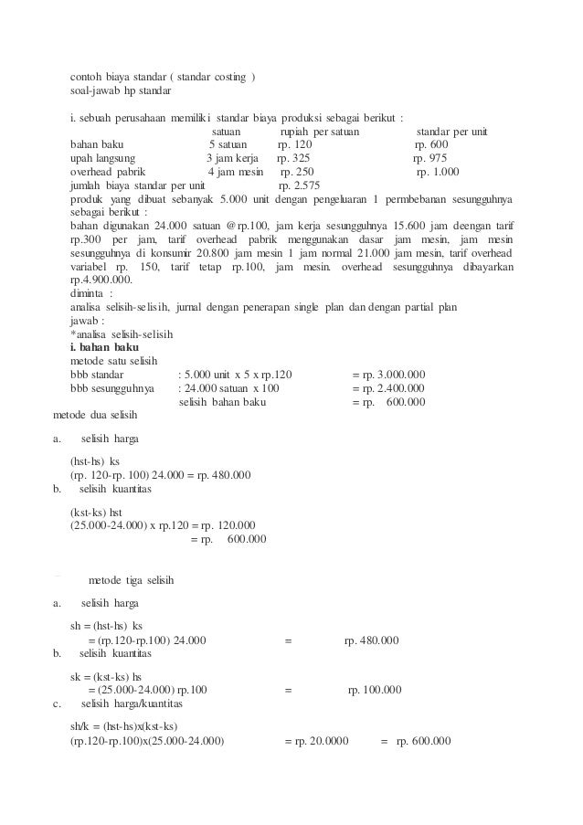 Contoh soal biaya standar. Contoh soal biaya standar akuntansi manajemen contoh soal dan jawaban biaya standar. Biaya standar adalah biaya yang ditentukan dimuka yang merupakan biaya yang seharusnya untuk membuat satu satuan produk atau untuk membiayai kegiatan tertentu dibawah asumsi kondisi ekonomi efisiensi dan faktor faktor lain tertentu. Upah langsung 3 jam kerja rp. Biaya standar adalah biaya yang ditentukan dimuka yang merupakan jumlah biaya yang seharusnya dikeluarkan untuk membuat satu satuan produk atau untuk membiayai kegiatan tertentu. Biaya standar adalah biaya yang ditentukan dimuka yang merupakan jumlah biaya yang seharusnya dikeluarkan untuk membuat satu satuan produk atau membiayai kegiatan tertentu dibawah asumsi kondisi ekonomi efisiensi dan faktor faktor lain tertentu. Bahan baku 5 satuan rp.