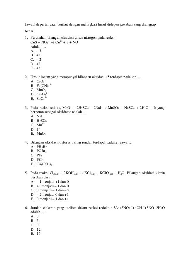 Dalam bahasa inggris bilangan oksidassi adalah oxidation state. Suatu reaksi tergolong reaksi redoks atau bukan dapat dilakukan dengan mengecek bilangan oksidasi masing masing atom tiap senyawa yang terlibat dalam reaksi. Bilangan oksidasi biloks didefinisikan sebagai jumlah muatan negatif dan positif dalam atom yang secara tidak langsung menandakan jumlah elektron yang telah diterima atau diserahkanatom yang menerima elektron akan bertanda negatif atom yang melepaskan elektron bertanda positif. Artikel ini membahas tentang kumpulan contoh soal dan pembahasan tentang cara mudah menentukan bilangan oksidasi beserta pembahasannya lengkap. Bilangan oksidasi adalah nilai muatan atom dalam sebuah senyawa atau ion. Reaksi redoks reduksi dan oksidasi contoh soal aplikasi bilangan oksidasi kimia selain reaksi penggabungan reaksi penguraian dan reaksi metatesis masih terdapat satu jenis reaksi yang penting yaitu reaksi reduksi oksidasi redoksreaksi ini memiliki aplikasi yang sangat penting sebab merupakan reaksi kimia yang menghasilkan energi listrik siap pakai seperti pada baterai dan aki.