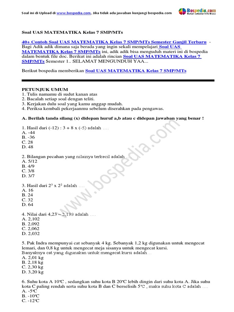 Lengkap 40 Contoh Soal Latihan Matematika Kelas 7 Smp Mts