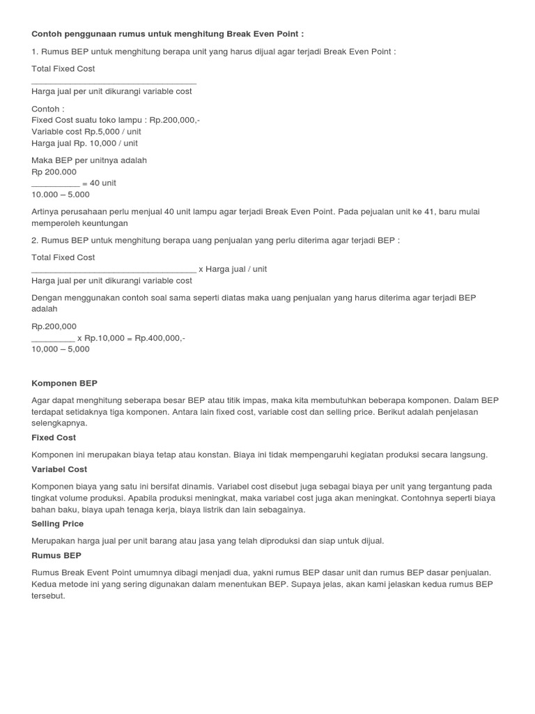 Contoh soal break even point dan penyelesaiannya. Analisis laporan keuangan dosen pengampu. Wigiyanti break even point dan contoh kasus a. Biaya produksi harga jual dan banyaknya penjualan. Semoga contoh soal dan pembahasan break even point contoh soal dan jawaban break even point ini bisa menambah wawasan kamu. Contoh soal break even point. Pengertian analisis break even point analisis bep mempunyai hubungan yang sangat erat dengan program budget walaupun analisa bep dapat diterapkan dengan data historis.