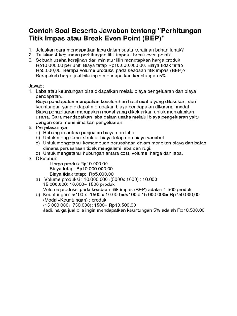 Perusahaan akan membeli mesin untuk mengganti pekerja jika hal ini dilaksanakan maka biaya tetap akan naik rp 228000 dan biaya variabel akan turun rp 100000 pada penjualan rp 8000000. Break even point bep ialah titik impas di mana posisi jumlah pendapatan dan biaya sama atau seimbang sehingga tidak terdapat keuntungan ataupun kerugian dalam suatu perusahaanbep ini digunakan untuk menganalisis proyeksi sejauh mana banyaknya jumlah unit yang diproduksi atau sebanyak apa uang yang harus diterima untuk mendapatkan titik impas atau kembali modal. Pengertian rumus dan cara menghitung break even point dalam sebuah usaha atau bisnis dipakai suatu ukuran umum dalam menentukan dan menilai keberhasilan manajemen usaha dalam mencapai target penjualan sehingga terjadi keuntungan atau laba maksimal. Fixed cost suatu toko lampu. Berikut ini contoh dari soal bep yakni sebagai berikut. Cara menghitung bep break even point contoh soal mencari bep.