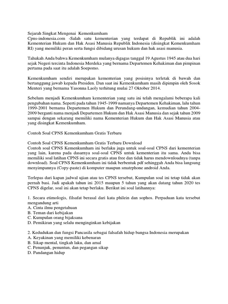 Contoh soal cpns kemenkumham gratis. Contoh soal cpns kemenkumham ini berlaku juga untuk soal soal cpns dari kementerian yang lain karena pada dasarnya soal soal cpns untuk kementerian itu sama. Contoh soal cpns cat skd skb kemenkumham 2019 adalah merupakan postingan yang akan saya bagikan kali ini. Sudah menjadi tanggung jawab bkn selaku lembaga pelaksana perekrutan calon pegawai negeri sipil untuk menyiapkan segala kebutuhan peserta cpns dalam mengikuti seleksi ini. Kita bisa mendapatkannya dengan mudah. Anda bisa memiliki soal latihan cpns ini secara gratis atau free dan tidak harus mendownloadnya tanpa download. Juga kamu bisa melihat nilai langsung saat selesai.