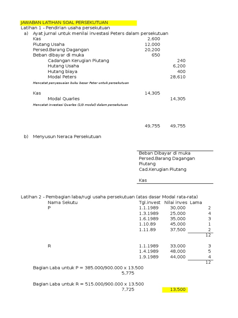 Contoh soal dan jawaban pembentukan persekutuan. Pembentukan persekutuan dan pembagian laba atau rugi persekutuan. Tuan budi akan menyetor modal berupa kas rp 150000000. Neraca perusahaan perseorangan tuan agus pada saat itu adalah. Tuan omar bakri sudah mempunyai perusahaan perseorangan yang bergerak di bidang servis dan perawatan kendaraan bermotor dan akan menggunakan aktiva bersih perusahaan perseorangan tersebut sebagai setoran modal. F i r m a a karakteristik f. Tuan a b dan c mendirikan suatu persekutuan dengan investasi masing masing rp7500000 rp2500000 dan rp5000000 mereka setuju untuk membagi keuntungan atau kerugian dengan perbandingan yang sama.