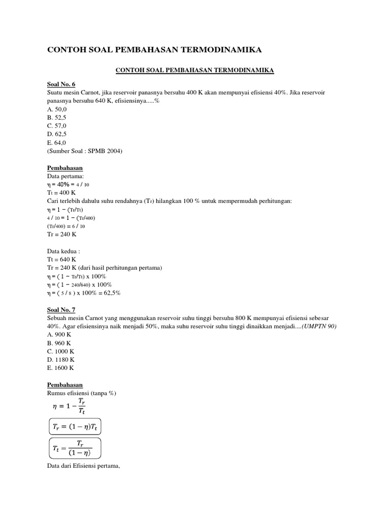 Contoh soal dan pembahasan termodinamika. 6 suatu mesin carnot jika reservoir panasnya bersuhu 400 k akan mempunyai efisiensi 40. Contoh soal termodinamika pembahasan jawaban kelas 11 soal no1 sbmptn 2017 suatu mesin dalam satu siklus menyerap kalor sebesar 2 x 10 3 joule dari reservoir panas dan melepaskan kalor 15 10 3 joule ke reservoir yang temperaturnya lebih rendah. Jika tekanan gas adalah 2 atm tentukan usaha luar gas tersebut. Pada suhu tinggi kecepatan. 1 suatu gas memiliki volume awal 20 m 3 dipanaskan dengan kondisi isobaris hingga volume akhirnya menjadi 45 m 3. Oktober 31 2019 januari 26 2020 admin contoh soal termodinamika pembahasan soal termodinamika termodinamika postingan ini membahas contoh soal termodinamika dan pembahasannya.