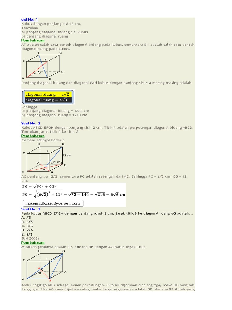 Contoh soal diagonal ruang kubus. Perhatikan gambar di bawah berikut ini. Rumuscoid setelah sebelumnya kita membahas tentang rumus volume bangun ruang kali ini kita akan membahas materi tentang rumus cara menghitung persen kita akan jabarkan secara detail dan lengkap dari pengertian permukaan kubus rumus dan contoh soal dari luas permukaan kubus. Kubus rumus geometri kubus adalah bangun ruang tiga dimensi yang dibatasi oleh enam bidang sisi yang kongruen berbentuk bujur sangkarkubus memiliki 6 sisi 12 rusuk dan 8 titik sudut. Pengertian bidang diagonal pada pembahasan sebelumnya. Ruang dan bidang diagonal kubus. Diagonal ruang adalah suatu garis yang menghubungkan 2 titik sudut yang saling berhadapan dalam satu ruang.