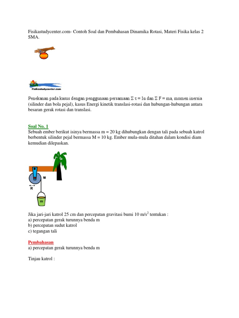 Contoh soal dinamika rotasi. Penekanan pada kasus dengan penggunaan persamaan σ τ iα dan σ f ma momen inersia silinder dan bola pejal kasus energi kinetik translasi rotasi dan hubungan hubungan antara besaran gerak rotasi dan translasi. Contoh soal dan pembahasan dinamika rotasi materi fisika kelas 2 sma. Contoh soal energi dan usaha. Pada gambar diatas sebuah katrol silinder pejal dengan massa 3kg dan berjari jari 20 cm dihubungkan dengan dua buah tali yang masing masing memiliki terpaut pada benda bermassa dimana m 1 6kg dan m 2 3kg. Pengertian rumus dan pembahasan contoh soal aksi akrobat selalu menghadirkan decak kagum setiap orang yang menyaksikan. Pintu juga salah satu contoh penerapan dinamika rotasi terkhusus konsep momen gaya karena bila kita mendorong atau memberikan gaya pada ujung pintu maka pintu akan berputar dan lebih muda untuk membukanya.