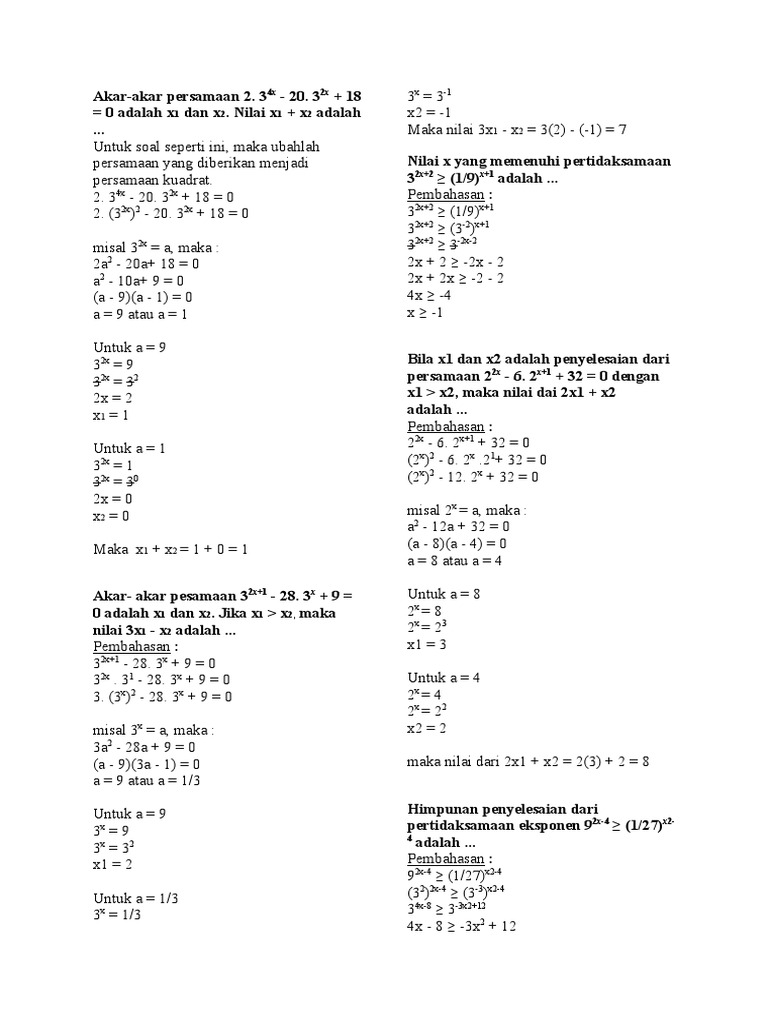Jika x 1 dan x 2 memenuhi persamaan dibawah ini maka nilai x 1 dan x 2 adalah. Tentukan penyelesaian dari 3 2x 2 5 x 1 jawab. Materi pembahasan pengertian sifat sifat jenis jenis rumus persamaan eksponen dan contoh soal serta pembahasannya. Syaratnya a tidak boleh sama dengan nol. Contoh soal dan pembahasan tentang eksponen sma contoh soal dan pembahasan tentang sifat eksponen sma contoh soal dan pembahasan tentang pertidaksamaan eksponen sma contoh soal dan pembahasan tentang persamaan eksponen sma. Tentukan nilai x dari persamaan 35x 1 27x3 0 jawab.