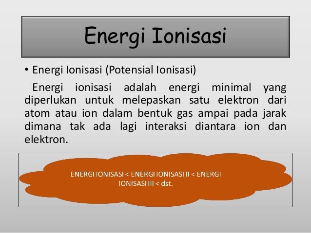 Pembahasan soal nomor 3. Energi ionisasi pengertian penjelasan contoh soal dan pembahasan unsur unsur yang terdapat dalam satu golongan dalam tabel priodik unsur energi ionisasinya makin ke bawah semakin kecil. Proses ionisasi kemuatan negatif atau positif sedikit berbeda. Energi yang didapatkan oleh atom ini bisa berasal dari berbagai sumber energi seperti energi listrik panas dan lain sebagainya. Sifat keperiodikan energi ionisasi energi ionisasi adalah energi yang diperlukan suatu atom untuk melepaskan satu elektron valensi membentuk ion positif. Pengertian ionisasi disosiasi dan eksitasi beserta contohnya ionisasi merupakan suatu proses mengubah molekul atau atom menjadi ion dengan mengurangi atau menambah partikel bermuatan seperti elektron adat lainnya.