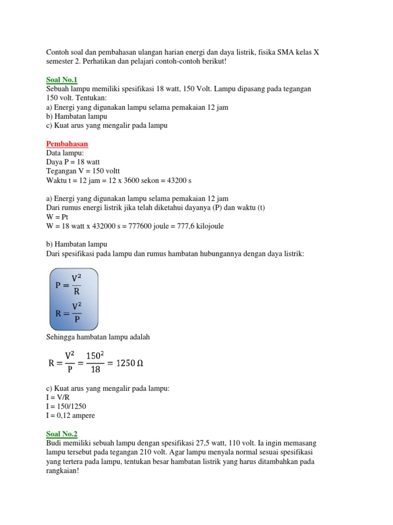 Contoh soal energi listrik. Berikut ini adalah penjelasan lengkap tentang rumus energi listrik yang meliputi pengertian energi dan berbagai macam rumus energi listrik beserta contoh soalnya. Pengertian rumus dan satuan energi listrik beserta contoh soalnya lengkap energi listrik merupakan kebutuhan pokok yang harus dipenuhi karna tanpa ada nya energi listrik setiap aktivitas manusia akan sulit untuk dikerjakan karna semua aktivitas rata rata memakai energi listrik. Rumus energi listrik adalah suatu cara untuk menghitung energi listrik baik dalam rangkaian potensial maupun dalam rangkaian lanya. Contoh soal energi dan daya listrik ini disusun dalam bentuk pilihan ganda dilengkapi dengan pembahasan dan dirancang sedemikian berdasarkan beberapa subtopik yang paling sering keluar dalam kajian energi dan daya listrik untuk tingkat menengah pertama. Rumus contoh soal energi listrik. Energi listrik adalah sebuah energi utama yang berfungsi untuk peralatan peralatan elektronik yang didalamnya tersimpan arus listrik dengan satuan ampere a tegangan listrik dengan satuan volt v dan ketentuan kebutuhan konsumsi daya listrik dengan satuan walt w.