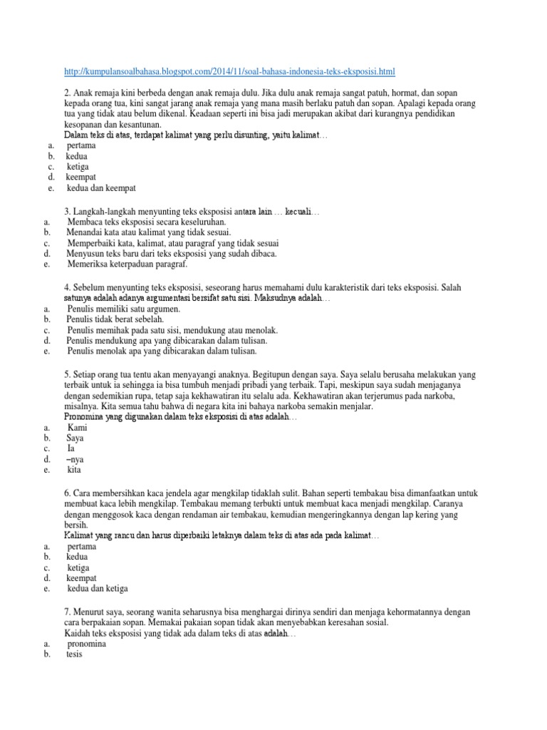Contoh soal essay teks eksposisi beserta jawaban. Berikut informasi sepenuhnya tentang contoh teks analytical exposition beserta soal essay dan jawaban. 45 contoh soal essay bahasa indonesia kelas 10 smama dan kunci jawabnya terbaru bospedia telah menyiapkan soal untuk adik adik nih soal ini merupakan mata pelajaran bahasa indonesai untuk kelas 10 smama soal ini diasiapkan sebanyak 45 soal dan sudah tersedia dengan kunci jawabannyaoiya istilah resensi berasal dari bahasa belanda resentie yang berarti kupasan atau pembahasan. Contoh soal teks eksplanasi pilihan ganda dan jawabannya demikianlah artikel tentang 50 contoh soal bahasa indonesia tentang teks eksposisi pilihan ganda dan jawabannya. Soal teks eksposisi pilihan ganda beserta jawaban berikut ini adalah soal cpns 2019 terbaru pdf dan kunci jawaban yang merupakan kumpulan file dari berbagi sumber wallpaper tentang soal teks eksposisi pilihan ganda beserta jawaban yang bisa bapakibu gunakan dan diunduh secara gratis dengan menekan tombol download biru dibawah ini. Semoga bermanfaat bagi anda. Soal revisi sd smp sma.
