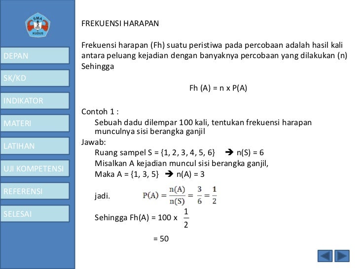 Fh n x pa contoh. Yang dimaksud dengan frekuensi harapan dari suatu kejadian adalah banyaknya kejadian yang terjadi dikalikan dengan peluang kejadian tersebut. Soal soal 8 uncategorized 12 recent posts. Contoh soal frekuensi harapan dan jawabannya berikut ini adalah kisi kisi soal pretest ppg 2018 yang merupakan kumpulan file dari berbagi sumber kisi kisippg tentang contoh soal frekuensi harapan dan jawabannya yang bisa bapakibu gunakan dan diunduh secara gratis dengan menekan tombol download biru dibawah ini. Dari 7 kartu diberi huruf s u c i p t o diambil sebuah kartu secara acak. Masih mau dan nggak bosan belajar math.
