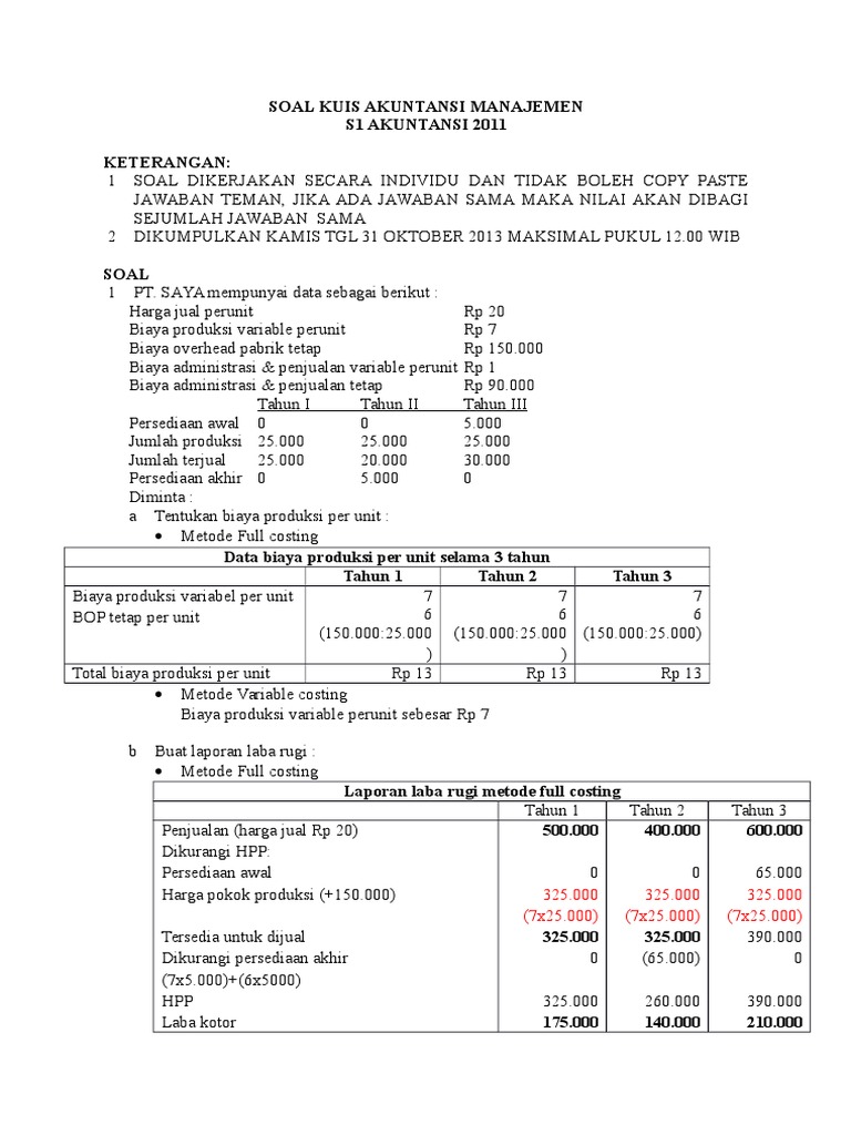 Contoh soal full costing dan variable costing. Contoh file soal uts lengkap kelas 1 6 sdmi semua mata pelajaran 20162017 berikut ini adalah kumpulan dari berbagi sumber tentang contoh soal akuntansi manajemen full costing dan variable costing yang bisa gunakan untuk bank soaldownloadsd dan diunduh secara gratis dengan menekan tombol download biru. Contoh soal variabel costing dan absorption costing. Penentuan harga pokok produksi metode variable costing full costing perbandingan metode full costing dengan metode variable costing. Full cost adalah total biaya yang berasal dari semua sumber daya yang digunakan atau dikonsumsi dalam produksi termasuk biaya langsung biaya tidak langsung dan biaya investasi. Contoh soal direct costing dan full costing. Berikut informasi sepenuhnya tentang contoh soal laporan laba rugi full costing dan variable costing.