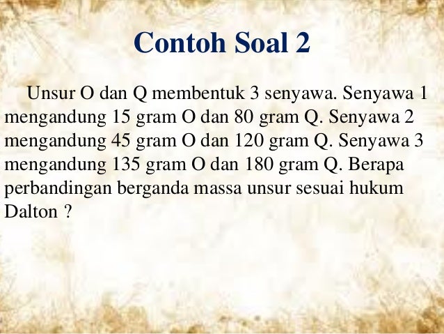 Agar kalian paham mengenai penerapan hukum kelipatan perbandingan atau hukum dalton silahkan kalian pelajari beberapa contoh soal dan pembahasannya berikut ini. Dalton mengamati adanya suatu keteraturan yang terkait dengan perbandingan massa. Kadar belerang dalam senyawa i adalah 50 dan ii 40. Contoh soal hukum dalton dan pembahasan. John dalton seorang guru smu di manchester inggris itu pertama kali mengemukakan teori hukum ini di tahun 1803 silam john dalton membuat hukum dalton ini berdasarkan penelitian dan pengamatan yang dilakukan dengan melihat nilai nilai perbandingan proust karena beberapa tahun sebelumnya joseph proust telah mengemukakan hukum perbandingan tetap yang tentunya hukum kimia proust ini sudah. Hukum perbandingan berganda dalton konsep bunyi dan contoh soal john dalton seorang guru sekolah dari inggris yang ahli dalam fisika dan kimia pada tahun 1803 yang menemukan hukum perbandingan berganda.