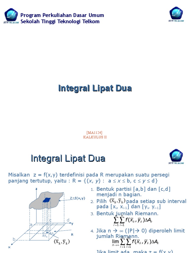 Contoh yang akan kita bahas adalah penerapan integral lipat dua dalam mencari sebuah volume v dan juga titik pusat massa. Luas dari suatu bidang dapat dipandang dengan sustu integral lipat dua jika fxy1 sehingga integral lipat dua menjadi. Soal dan pembahasan integral lipat duadoc. Dan setiap garis garis yang sejajar dengan sumbu sumbu koordinat paling banyak hanya mempunyai dua titik potong dengan kurva. Kalkulus ii integral lipat dua malik abdul aziz. Dalam hal ini yang akan dibahas adalah asal mula integral lipat dua.