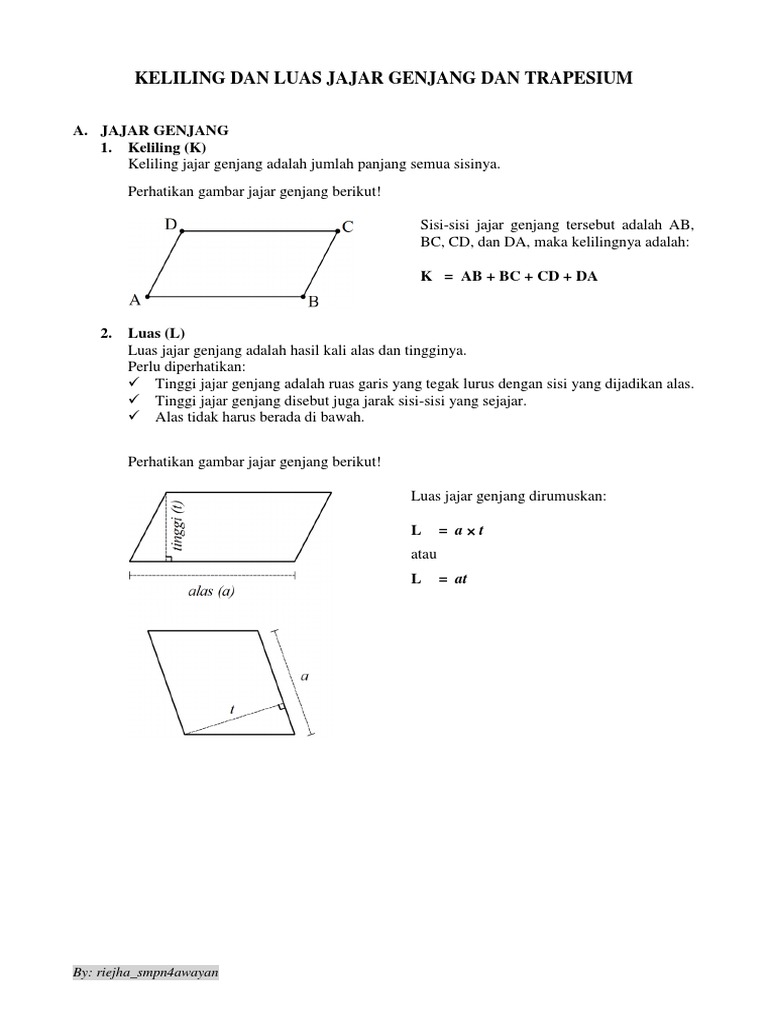 Contoh soal jajar genjang. Sifat luas keliling contoh soal. Kalau sudah mempelajari teorinya berikut mafia online berikan contoh soal dengan pembahasannya tentang cara mencari keliling dan luas jajar genjang. Sebuah jajar genjang memiliki panjang alas 20 cm dan ukuran tinggi 10 cm. Diketahui a 20 dan t 10 maka. Nah bagi kalian yang masih kurang paham atau sama sekali belum paham berikut ini telah kami siapkan beberapa contoh soal dan penyelesaiannya agar kalian lebih paham. Luas i 12 cm x 9 cm.