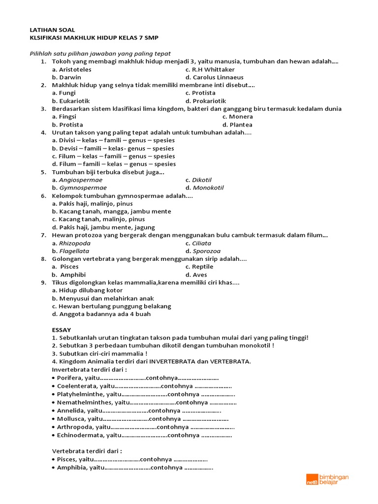 Contoh soal klasifikasi makhluk hidup pilihan ganda kunci jawabannya dalam setiap pernyataan suatu kejadian menurut sistem biologi dan ekologi organisme bahasa yunani. Di dalam membantu peserta didik memahami materi klasifikasi makhluk hidup berikut ini admin bagikan soal klasifikasi makhluk hidup materi ipa kelas 7 smpmts kurikulum 2013. Organon berarti alat merupakan kumpulan molekul molekul yang saling memengaruhi sedemikian sehingga berfungsi secara stabil dan memiliki sifat hidup. C fungi tidak memiliki klorofil. Tujuan dari klasifikasi makhluk hidup adalah. Dasar dasar klasifikasi makhluk hidup bisa dibaca di sini.