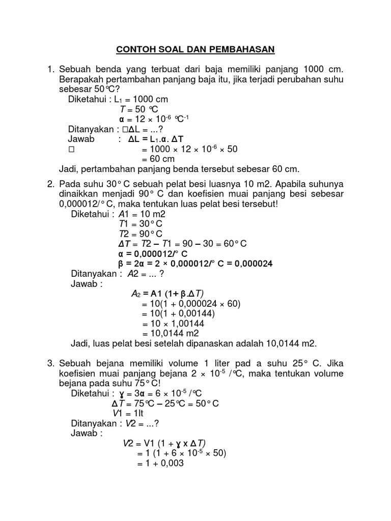 Y yaitu koefisien muai volume c v yaitu pertambahan volume m3 contoh soal pemuaian. Pertambahan suhu δt 70 o c 20 o c 50 o c panjang awal l 1 40 cm koefisien muai panjang baja a 10 5 o c 1 ditanya. Rumus koefisien muai panjang dan contoh soal jika suhu atau temperatur dari sebuah benda naik kemungkinan besar benda tersebut akan mengalami pemuaian. Sebatang baja bersuhu 20 o c memiliki panjang 40 cm. Pemuaian panjang zat padat ditentukan oleh koefisien muai panjang zat padat itu. Sekeping aluminium dengan panjang 40 cm dan lebar 30 cm dipanaskan dari 40 o c sampai 140 o c.