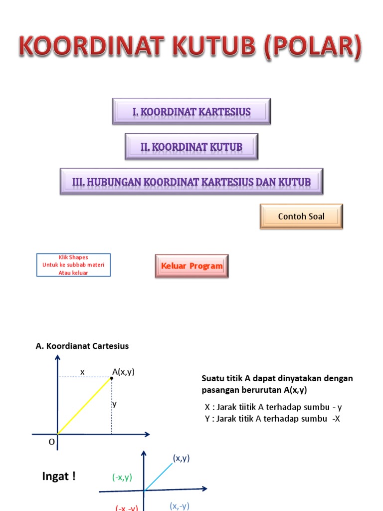 Untuk bentuk soal cerita silahkan tinggal dikarang saja pada posisi objek tertentu yang bisa dinyatakan dalam koordinat kartesius atau kutub. Jika diketahui koordinat kutub titik p 52 315º maka koordinat kartesiusnya adalah.