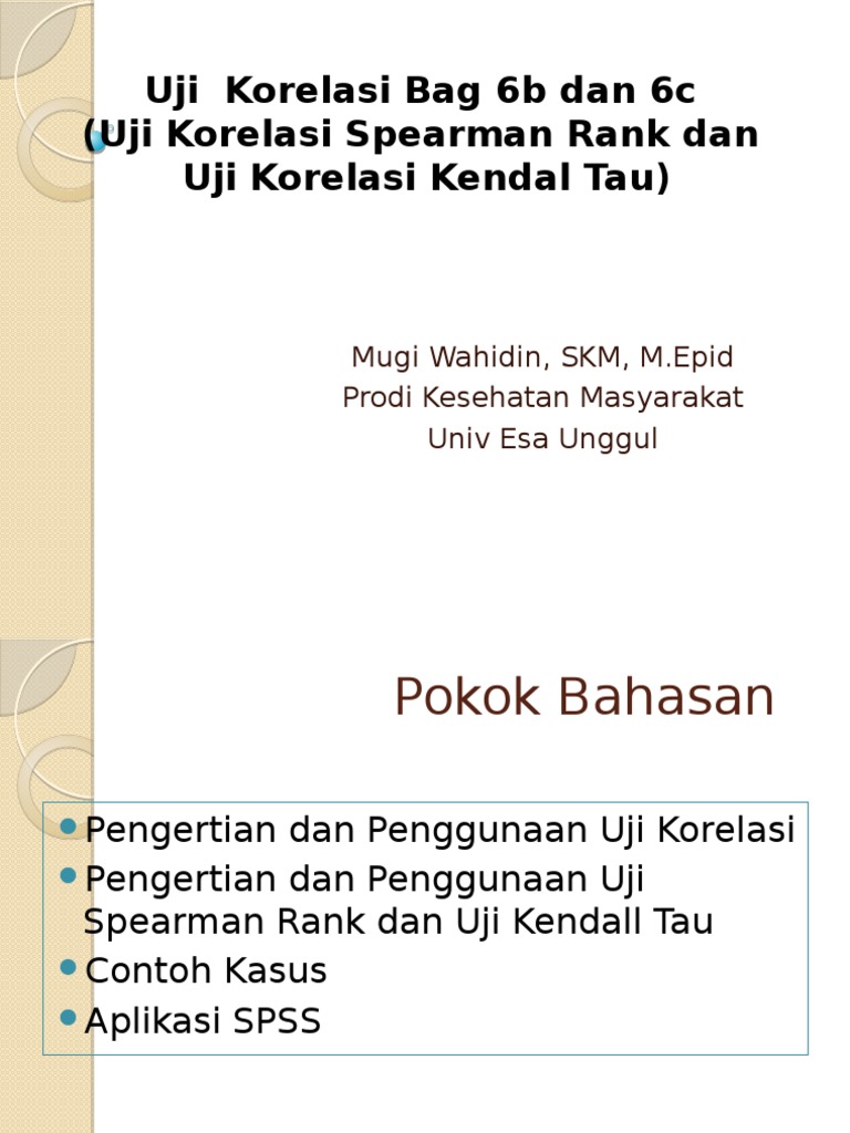 5 n jumlah pasangan rank untuk spearman 5 n 30 selesih setiap pasangan rank 2 d nilai korelasi spearman rank 1 6 1 2 2 u u n n d i rumus ini digunakan jika tidak ada nilai yang sama untuk setiap variabel. Koefisien korelasi kendall tau ppt download. Monoton turun berasosiasi dengan korelasi negatif contoh. Ada 10 orang responden yang diminta untuk mengisi daftar pertanyaan tentang motivasi dan prestasi dalam sebuah kantor. Admin blog contoh soal terbaik 2019 mengumpulkan gambar gambar lainnya yang berhubungan dengan contoh soal korelasi rank spearman pdf dibawah ini. Koefisien korelasi spearman atau spearmans coefficient of rank correlation dan kendall digunakan untuk pengukuran statistik non parametrik data ordinal.