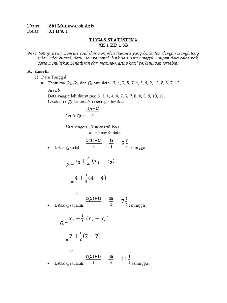 Kuartil dan desil. Kuartil desil dan persentil ialah sebuah metode atau cara membagi data menjadi sama banyak. Contoh soal kuartil beserta jawabannya. Persentil adalah membagi data menjadi 100 sama banyak. C 25. Banyak data n adalah 40 karena kuartil bawah terletak di tiga perempat bagian bawah data atau seperempat bagian atas data maka kuartil atas terletak pada data ke 30 yakni pada kelas 160 164.