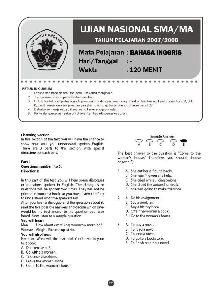 Contoh soal listening bahasa inggris. Setiap bagian utama memiliki karakter yang tersendiri. Berikut contoh latihan online soal un unbk usbn bahasa inggris sma tahun 2020 sma ipa sma ips dan sma bahasa. Pictures gambar part ii. Listening adalah salah satu skill dalam bahasa inggrismendengar mempunyai makna dapat menangkap bunyi dengan telinga. Sadar atau tidak kalau ada bunyi alat pendengar kita akan menangkap atau mendengar bunyi bunyi tersebut. Soal listening section mp3 bahasa inggris dan teksnya by om min posted on april 5 2016 hai semuanya berbicara mengenai listening mungkin sebagian orang sudah tidak asing lagi bahkan ada yang memiliki kegemaran dalam hal ini contohnya listening the radio listening the music and soon.