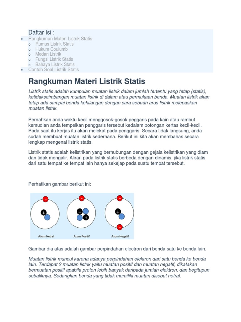 Contoh soal listrik statis. Contoh soal listrik statis. Download rangkuman contoh soal listrik statis dalam bentuk pdf klik disini. Kumpulan soal dan pembahasan fisika listrik statis medan listrik. R 1 r. Jika jarak kedua muatan didekatkan menjadi 14 kali semula maka gaya tolak menolak antara kedua muatan tersebut menjadi.