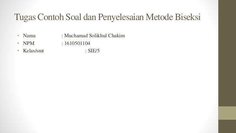 151 074 002 kelas. Contoh soal dan pembahasan metode bagi dua metode numerik martha yunanda contoh soal bisection method atau dikenal dengan metode bagi dua cara yang digunakan untuk menentukan akar sebuah fungsi yang berada di antara dua titik pada sumbu hoizontal sumbu x. 2042012 092700 am in metode biseksi nama. Persamaan linear dan persamaan.