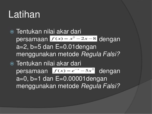 Makalah metode numerik regula falsi dalam menyelesaikan persamaan non linier kita sering menemukan fungsi yang rumit sehingga untuk mencari penyelesaiannya atau untuk mencari fx 0 kita perlu menggunakan cara pendekatan atau cara dengan metode. Dengan metode regula falsi tentukanlah akar dari persamaan. M etode regula falsi merupakan metode pencarian akar persamaan dengan memanfaatkan kemiringan dan selisih tinggi dari dua titik batas range. Tentukan nilai interval awal ab. Metode regula falsi adalah metode pencarian akar persamaan dengan memanfaatkan kemiringan dan selisih tinggi dari dua titik batas range. Seperti halnya metode biseksi metode ini bekerja secara iterasi dengan melakukan update rangetitik pendekatan yang digunakan oleh metode regula falsi adalah.