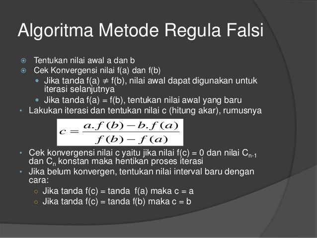 Metode regula falsi mirip dengan metode bagi dua. Kemiripannya terletak dalam hal diperlukan dua harga taksiran awal pada awal pengurungan akar persamaan. Subscribe to receive free email updates. Saturday 12 november 2016 komputer edit. Misal a 2 dan b 5 e 0001. Cek konvergensi nilai fa dan fb jika tanda fa fb nilai awal dapat digunakan untuk iterasi selanjutnya.