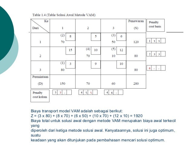 Solusi awal dengan metode inspeksi untuk masalah di atas. Jika matriks solusi awal menggunakan metode vam dan penyelesaian optimalnya menggunakan stepping stone dapat dilakukan sebagai berikut. Soal perusahaan abc memproduksi suatu produk yang akan mengirimkan hasil produksinya kepada 3 konsumen. Perusahaan makanan ringan ingin mendistribusikan produk terbarunya ke 4 agen yang menjadi pelanggan perusahaan makanan ringan tersebut dan ingin mendistribusikannya ke beberapa kota di indonesia dengan biaya antar kepada para agen di hitung dengan jarak tempat agen tersebut setiap per packnya. Alokasi produk ini harus diatur sedemikian rupa karena terdapat perbedaan biaya transportasi alokasi dari suatu sumber ke beberapa tujuan yang berbeda beda dan dari. Metode transportasi metode transportasi adalah suatu metode yang digunakan untuk mengatur distribusi dari sumber sumber yang menyediakan produk produk yang sama di tempat tempat yang membutuhkan.