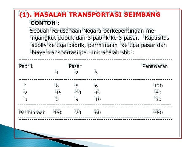 Contoh kasus metode transportasi studi kasus. Berikut contoh soal metode biaya transportasi yang saya buat sendiri. Perusahaan air mineral ingin mendistribusikan produk terbarunya ke empat agen yang menjadi pelanggan perusahaan air mineral tersebut dan ingin mendistribusikannya ke beberapa kota di indonesia dengan biaya atar kepada para agen di hitung dengan jarak tempat agen tersebut setiap per galonnya. Itulah yang dapat kami bagikan terkait contoh soal dan penyelesaian model transportasi. Tabel transportasi sebagai berikut. Berikut ini merupakan masing masing kapasitas pabrik secara berurutan sebesar 90 60 dan 50.