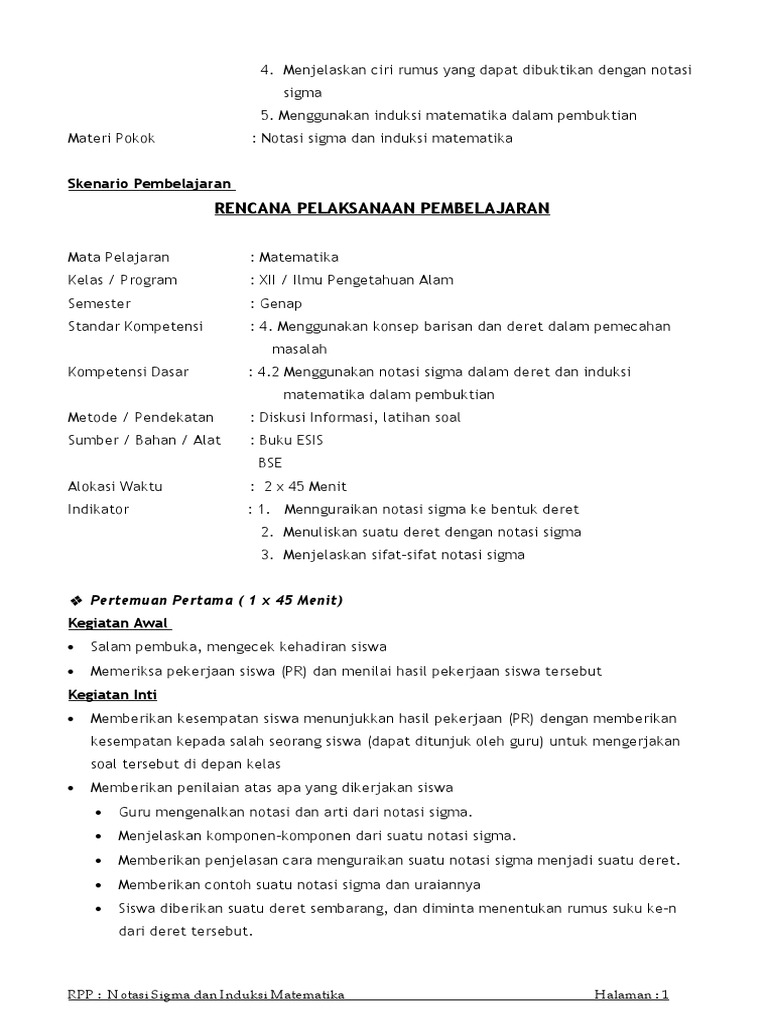 Contoh soal notasi sigma dan induksi matematika. Notasi sigma lambang dibaca sigma adalah huruf besar yunani yang berarti jumlah. Pelajari juga materi yang sebelumnya telah saya berikan seperti cara membaca tabel trigonometri metode menghitung volume benda putar dan lain sebagainya. Induksi matematika merupakan materi yang menjadi perluasan dari logika matematikalogika matematika sendiri mempelajari pernyataan yang bisa bernilai benar atau salah ekivalen atau ingkaran sebuah pernyataan dan juga berisi penarikan kesimpulan. Notasi sigma sangat penting karena banyak digunakan dalam materi lain seperti barisan dan deret serta induksi matematika. Materi notasi sigma memang rasanya tidak begitu menguras otak sehingga kita dapat dengan cepat mempelajarinya. Perhitungan yang melibatkan notasi sigma selanjutnya disebut sebagai operasi sumasi.