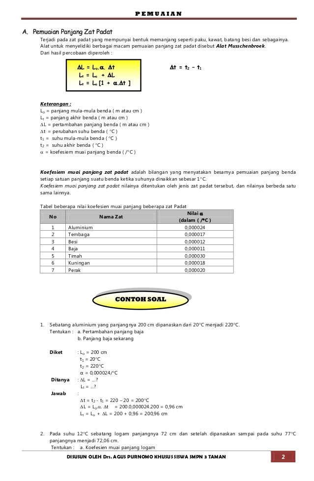 Pertambahan suhu δt 70 o c 20 o c 50 o c panjang awal l 1 40 cm koefisien muai panjang baja a 10 5 o c 1 ditanya. Berikut ini dibagikan latihan soal ipa pemuaian kelas 7 smp kurikulum 2013latihan soal ini untuk membantu belajar peserta didik kelas 7 smpmts dalam memahami materi pemuaian. Latihan soal ipa suhu dan perubahannya kelas 7 smp kurikulum 2013. Contoh file soal uts lengkap kelas 1 6 sdmi semua mata pelajaran 20162017 berikut ini adalah kumpulan dari berbagi sumber tentang contoh soal tentang pemuaian kls 7 yang bisa gunakan untuk bank soaldownloadsd dan diunduh secara gratis dengan menekan tombol download biru dibawah ini. Contoh file download contoh soal uts semester 1 tahun 2015 untuk sd semua kelas berikut ini adalah kumpulan dari berbagi sumber tentang soal pemuaian kelas 7 yang bisa gunakan untuk administrasicontoh soal dan diunduh secara gratis dengan menekan tombol download biru dibawah ini. Pemuaian dapat terjadi dalam tiga kondisi yaitu pemuaian panjang hanya dialami zat padat pemuaian luas hanya dialami zat padat dan pemuaian volume dialami zat padat cair dan gas.