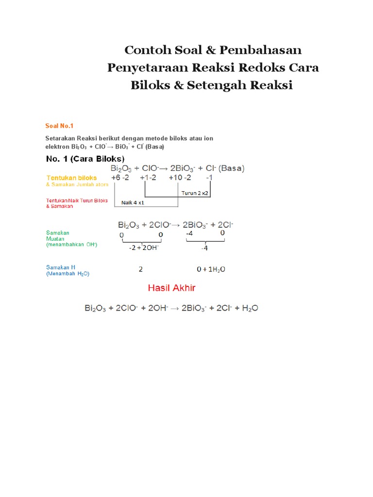 Contoh metode setengah reaksi redoks penyetaraan biloks bilangan oksidasi soal kimia dasar dari metode ini adalah jumlah elektron yang dilepaskan pada reaksi oksidasi dan reduksi sama. Untuk menyetarakan reaksi redoks dengan metode setengah reaksi perhatikan langkah langkah berikut. Cara bilangan oksidasi biloks.