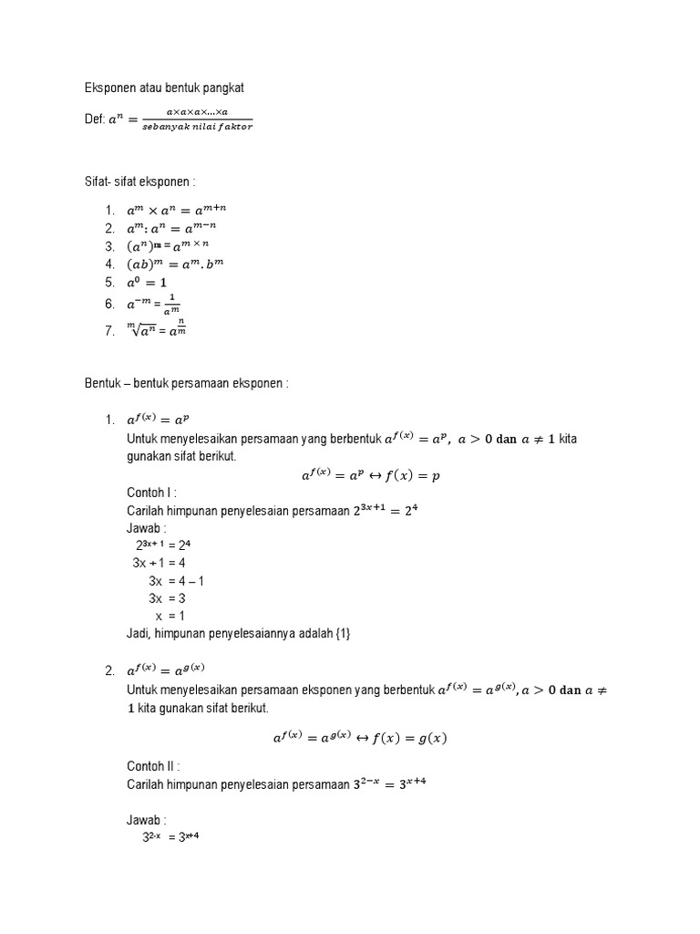 Artikel matematika kelas x ini akan menjelaskan cara untuk menyelesaikan bentuk persamaan dan pertidaksamaan eksponen disertai dengan beberapa contoh soalnya. Rumuscoid setelah sebelumnya kita membahas tentang rumus massa jenis kali ini kita akan membahas materi tentang rumus persamaan eksponen kita akan jabarkan secara detail dan lengkap dari pengertian persamaan eksponen sifat sifat persamaan eksponen jenis jenis persamaan eksponen beserta contoh soalnya. 35x 1 27x3 0 35x 1 33x3 35x 1 33x9 5x 1 3x 9 2x 10 x 5 contoh 7 soal. Kedua basis pada persamaan diatas berbeda dan tidak ada sifat sifat perpangkatan yang dapat kita gunakan untuk menyamakan kedua basis tersebut. Contoh soal dan pembahasan tentang eksponen sma contoh soal dan pembahasan tentang sifat eksponen sma contoh soal dan pembahasan tentang pertidaksamaan eksponen sma contoh soal dan pembahasan tentang persamaan eksponen sma.