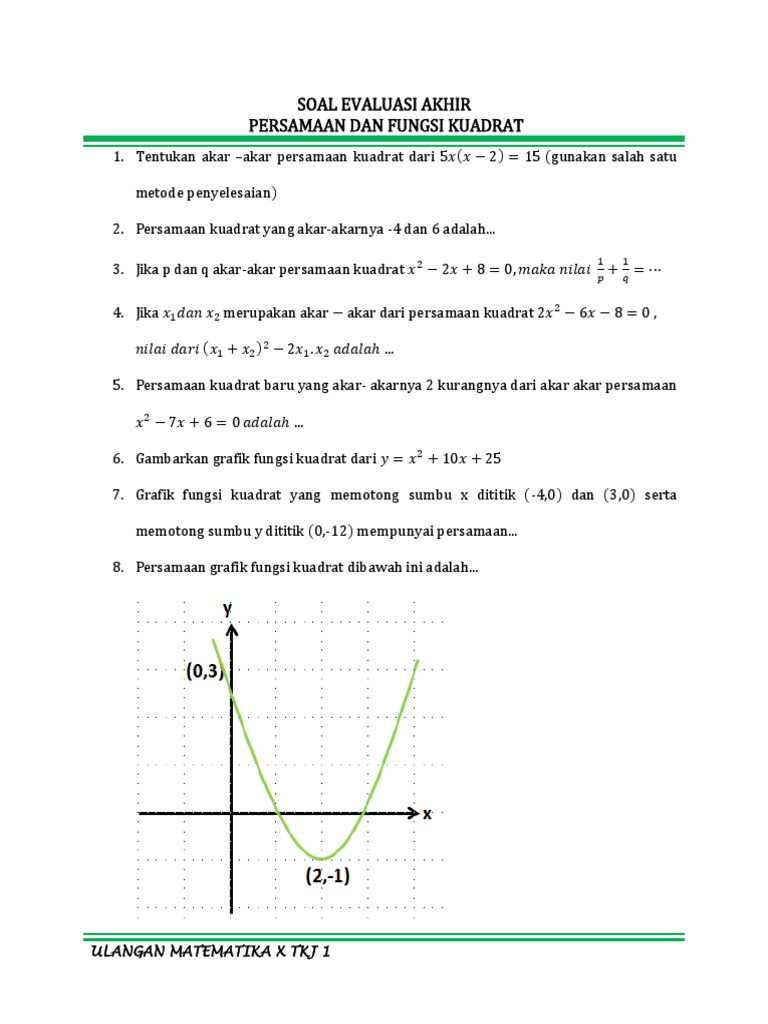 Contoh soal persamaan grafik fungsi kuadrat dan penyelesaiannya. Menentukan akar akar persamaan kuadrat ada beberapa cara diantaranya. X 2 6x 9 0 x 3 x 3 0 x 3 0 atau x 3 0 x 3. Postingan ini membahas contoh soal persamaan kuadrat dan penyelesaiannya atau pembahasannya. Sebagai contoh grafik dari fungsi. Ingat titik potong dengan sumbu x akan didapatkan apabila nilai y0 maka dari itu akan didapatkan bentuk persamaan kuadrat x 2 6x80. Persamaan kuadrat adalah persamaan yang hanya memuat satu peubah atau variabel dan pangkat tertinggi dari variabel tersebut adalah 2.