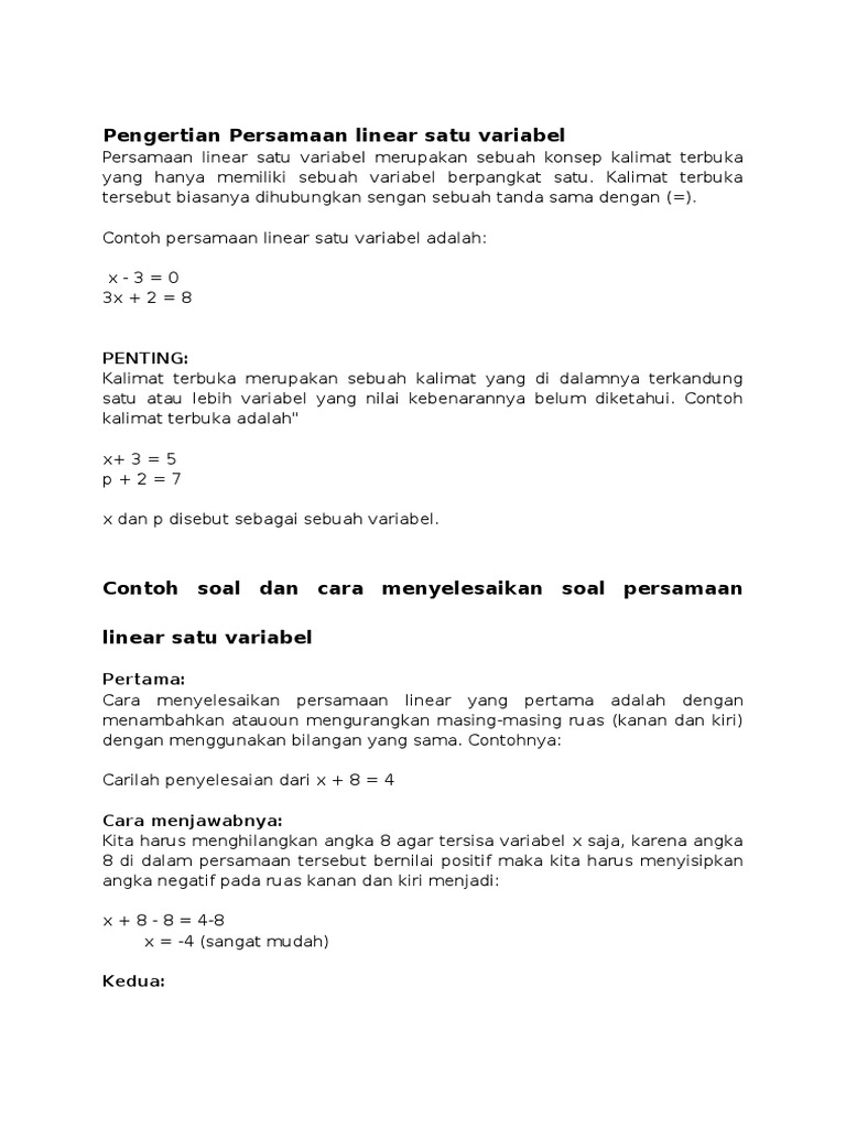 Sistem persamaannya bisa terdiri dari satu variabel dua variabel atau lebih. Pengertian dan contoh soal persamaan linear satu variabel beserta penyelesaian lengkap persamaan linear satu variabel adalah kalimat pembuka yang dihubungkan tanda sama dengan dan hanya memiliki satu variabel berpangkat 1.