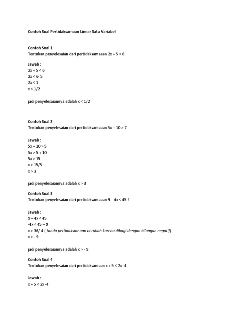 Pertidaksamaan kuadrat ax 2 bx c 0 ax 2 bx c 0 ax 2 bx c 0 ax. Yang dalam artikel jagomatematikainfo kali ini akan kita bahas yaitu salah satu materi matematika untuk sma kleas 10 yaitu tentang nilai mutlak. Contoh soal pertidaksamaan liniear contoh soal 1. Persamaan linear satu variabel pengertian rumus contoh soal dosenpendidikancom kalimat terbuka adalah kalimat yang belum dapat diketahui nilai kebenarannya. Artikel ini menyajikan kumpulan contoh soal tentang pertidaksamaan linear satu variabel beserta pembahasannya lengkap dengan gambar grafik selang atau garis bilangan himpunan penyelesaiannya. Yang meliputi pengertian pertidaksamaan linear satu variabel sifat sifat pertidaksamaan linear satu variabel contoh soal dan cara penyelesaian pertidaksamaan linear satu variabel dengan pembahasan lengkap dan mudah dimengerti.