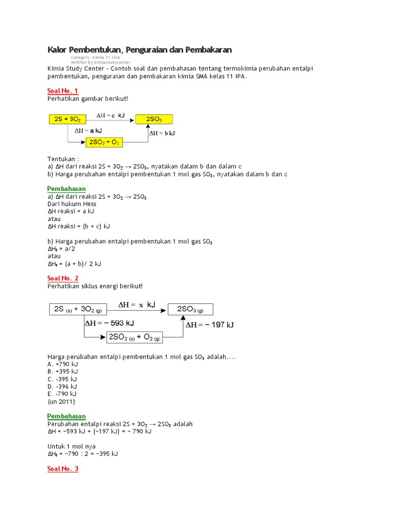 Energi ini diukur pada titik didih zat dan walaupun nilainya biasanya dikoreksi ke 298 k koreksi ini kecil. Perubahan entalpi δh 0 dipengaruhi suhu dan tekanan yang diukur pada kondisi standarkondisi standar yaitu pada tekanan 1 atm dan suhu 25 0 c atau 298 k dengan satuan kj sedangkan satuan δh molar reaksi adalah kjmol. Panas atau kalor penguapan atau lengkapnya perubahan entalpi penguapan standar δ v h o adalah energi yang dibutuhkan untuk mengubah suatu kuantitas zat menjadi gas. Contoh soal perhitungan perubahan entalpi reaksi pembakaran. Menentukan h reaksi bila perubahan entalpi pereaksi dan hasil reaksi diketahui menentukan h reaksi berdasarkan reaksi bersusun menentukan h reaksi dengan menganalisis diagram atau siklus reaksi yang. Diantaranya perubahan entalpi pembentukan standar δh 0 f.