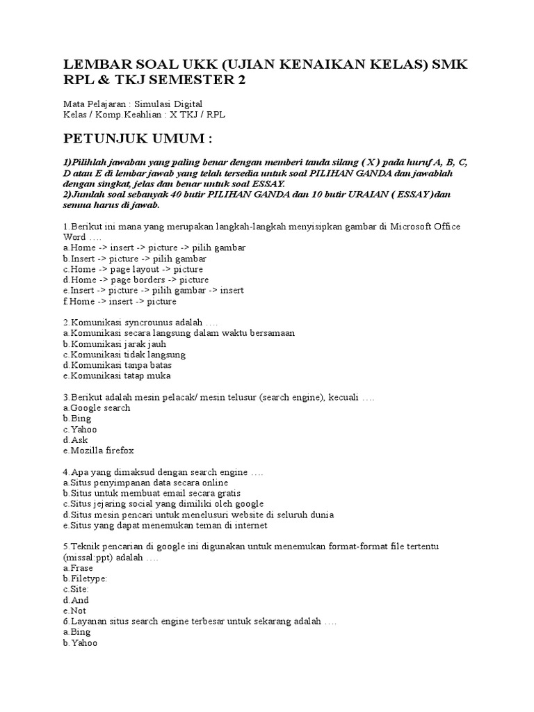 Contoh soal pilihan ganda simulasi digital dan jawabannya semester 2. Contoh soal dan jawaban pilihan ganda simulasi digital ini sering kali dipakai untuk tugas siswa atau juga sering digunakan untuk media soal untuk uts dan uas. Berikut ini saya posting kumpulan soal pilihan ganda pilgan uts simulasi digital semester 1 kelas x smk tentang komunikasi dalam jaringan dan penerapannya serta kelas maya sebanyak 30 butir soal beserta soal soal essay 15 butir soal. Apa kabar sahabat guru supendi88. Pilihan ganda pilihlah salah satu jawaban yang menurut kamu paling benar dengan memberikan tanda. Nama dan alamat c. User name dan password b.
